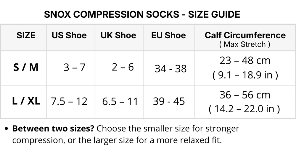 SNOX Compression Socks provide 15–20 mmHg of lab-tested, graduated compression for balanced, everyday support. Designed in a knee-high length, they stay comfortably in place without bunching and fit calf sizes up to 56cm. Made with ultra-soft, hypoallergenic cotton yarn and seamless 360° compression, they offer a smooth fit. Our size chart ensures an accurate fit