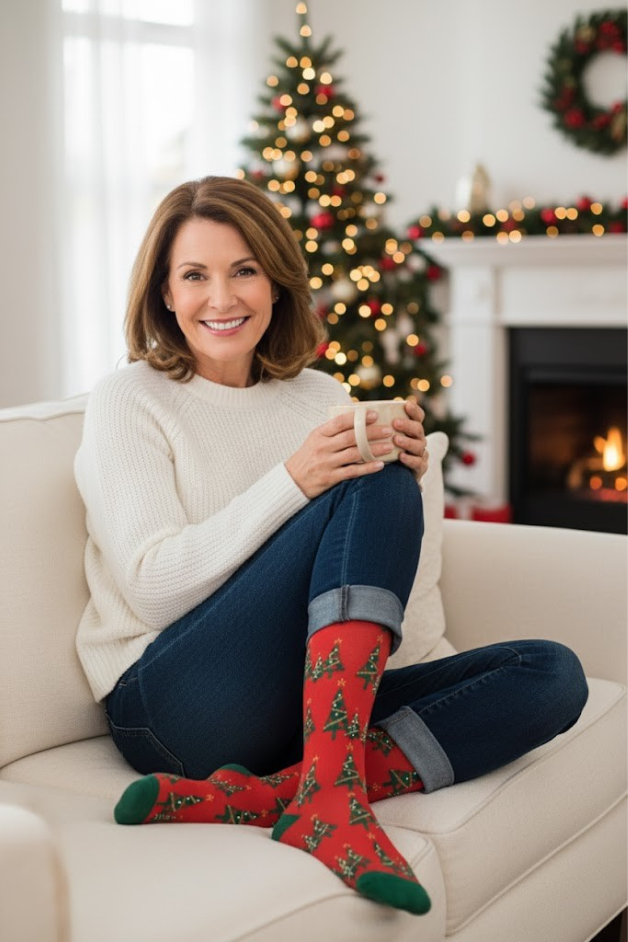 Helps prevent swelling in ankles and calves. Perfect for long days, travel or standing work.