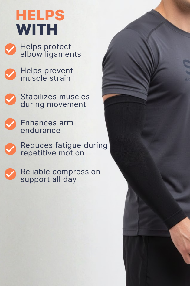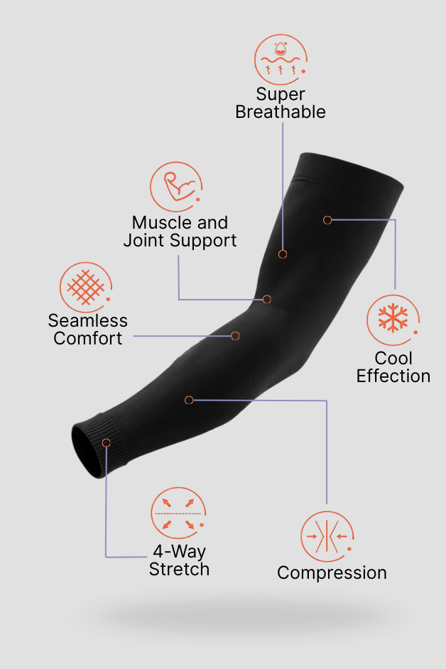 The sleeve features a smooth, skin-friendly texture that feels soft against the arm without causing irritation. Its flexible compression adapts naturally to your movement, providing a secure fit that stays in place without rolling or slipping. Firm yet comfortable, it delivers supportive pressure while allowing full range of motion.