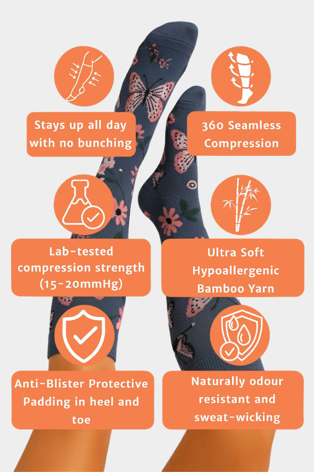 Experience the difference. Our compression socks promote circulation, helping your legs feel lighter, more energized, and less fatigued throughout the day.
